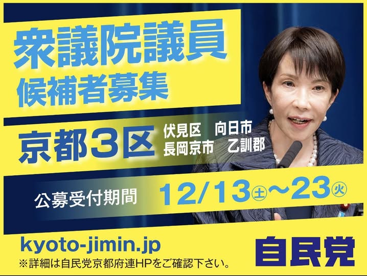 自民党の衆議院議員候補者(京都2区)の公募を明日から開始します。意欲のある方はぜひ挑戦して下さい!